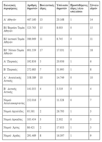 Η μία έδρα της Αττικής που μεταφέρεται στο νομό Αχαΐας και οι έδρες του από οκτώ γίνονται εννέα, ενώ οι προστιθέμενες έδρες λόγω υπολοίπου στην Αχαΐα από μηδενικές γίνεται μία.