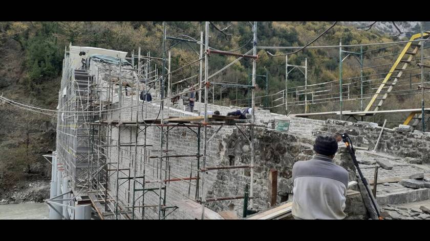 Πριν δύο ημέρες μπήκε και ο τελευταίος θολίτης, η πέτρα δηλαδή που δένει τις δύο πλευρές του τόξου, της καμάρας, η οποία άρχισε να ξανακτίζεται παράλληλα και από τα δύο βάθρα.