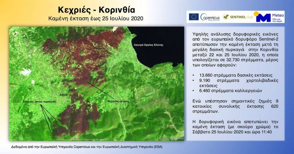 Σύμφωνα με την Ευρωπαϊκή Υπηρεσία Εκτάκτων Αναγκών Κοπέρνικος , η πρώτη εκτίμηση δείχνει πως περισσότερα από 32.730 στρέμματα έγιναν στάχτη μέχρι το μεσημέρι του Σαββάτου, καθώς και ιδιωτικές περιουσίες κοντά στις Κεχριές.
