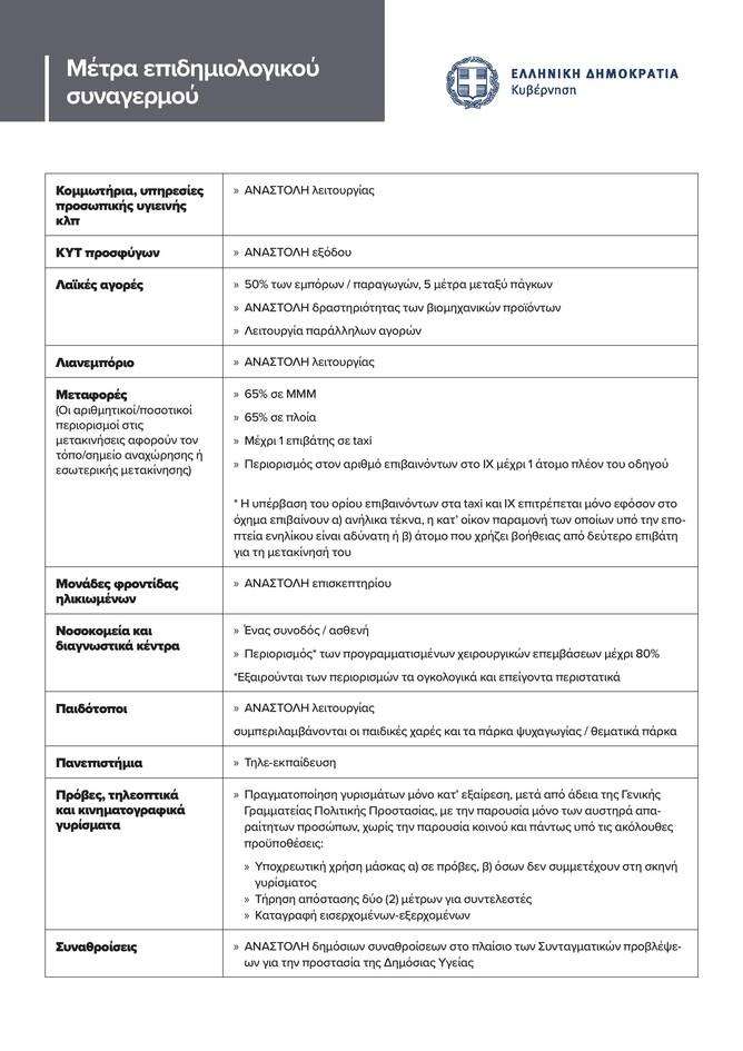 Στα νοσοκομεία και τα διαγνωστικά κέντρα συνεχίζει να επιτρέπεται 1 συνοδός ανά ασθενή, ενώ συνεχίζει να ισχύει η αναστολή του επισκεπτηρίου σε δομές πρόνοιας (όπως οι Μονάδες Φροντίδας Ηλικιωμένων).