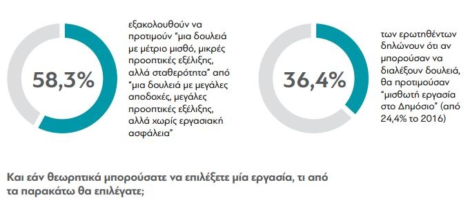 Ειδικότερα, σύμφωνα με τα αποτελέσματα και το 2022 η πλειοψηφία των Ελλήνων (58,3%) εξακολουθούν να προτιμούν «μια δουλειά με μέτριο μισθό, μικρές προοπτικές εξέλιξης, αλλά σταθερότητα» από «μια δουλειά με μεγάλες αποδοχές, μεγάλες προοπτικές εξέλιξης, αλλά χωρίς εργασιακή ασφάλεια», μια προτίμηση που φαίνεται να είναι σταθερή τα τελευταία 7 χρόνια.