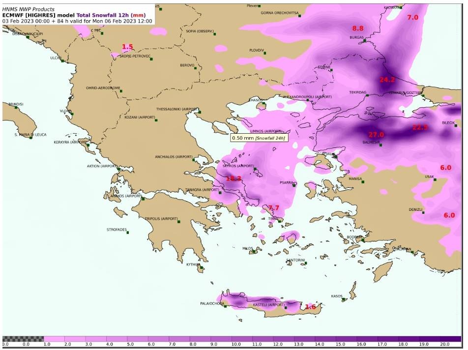 Οι χιονοπτώσεις αναμένεται να συνεχιστούν στην ανατολική Ελλάδα από τη Θεσσαλία και νοτιότερα (προσήνεμες περιοχές) καθώς επίσης στις Κυκλάδες και την Κρήτη, με μικρότερη όμως ένταση.