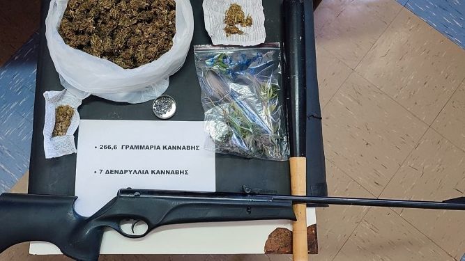 Σε βάρος του σχηματίστηκε δικογραφία για καλλιέργεια - διακίνηση ναρκωτικών ουσιών και οπλοκατοχή, καθώς βρέθηκαν και κατασχέθηκαν 267 γραμμάρια κάνναβης, 7 δενδρύλλια κάνναβης, ένα ρόπαλο και ένα αεροβόλο τυφέκιο.