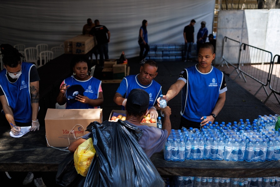 Στο κέντρο διανομής τροφίμων της Ιραζά – φημολογείται ότι είναι το δεύτερο μεγαλύτερο της Λατινικής Αμερικής – οι ιδρωμένοι εργάτες στοιβάζουν φρούτα σε χειροκίνητα καρότσια παρά την αμείλικτη ζέστη. «Ιδρώνεις στη σκιά και, αν μείνεις στον ήλιο, λιώνεις σαν παγωτό», αστειεύεται ο Geraldo Lima, 56 ετών, ένας άστεγος που βγάζει 9 ευρώ την ημέρα φορτώνοντας φορτηγά.
