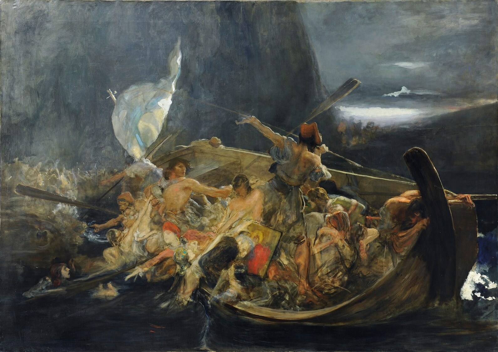 Η ιδέα της καταστροφής των Ψαρών απασχόλησε τον Γύζη από το 1896. Σε μια βάρκα που παλεύει με τα κύματα ξεχωρίζει η μορφή του όρθιου βρακοφόρου σε δυναμική στάση - έκφραση ελπίδας για πιθανή ευτυχή έκβαση και σωτηρία, ενώ οι υπόλοιποι αγωνίζονται να κρατηθούν ή να σώσουν όσους έχουν πέσει στη θάλασσα. Μέσα στη βάρκα της φυγής έχουν ωστόσο μαζί τους μια εικόνα και τη σημαία που κυματίζει.