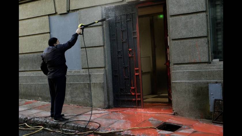 Τα μέλη του ΠΑΜΕ έγραψαν με κόκκινη μπογιά, στο κτίριο που στεγάζεται ο ΣΕΒ, συνθήματα για κατώτατο μισθό στα 751 ευρώ και ενάντια στην όποια παρέμβαση στο απεργιακό δικαίωμα.