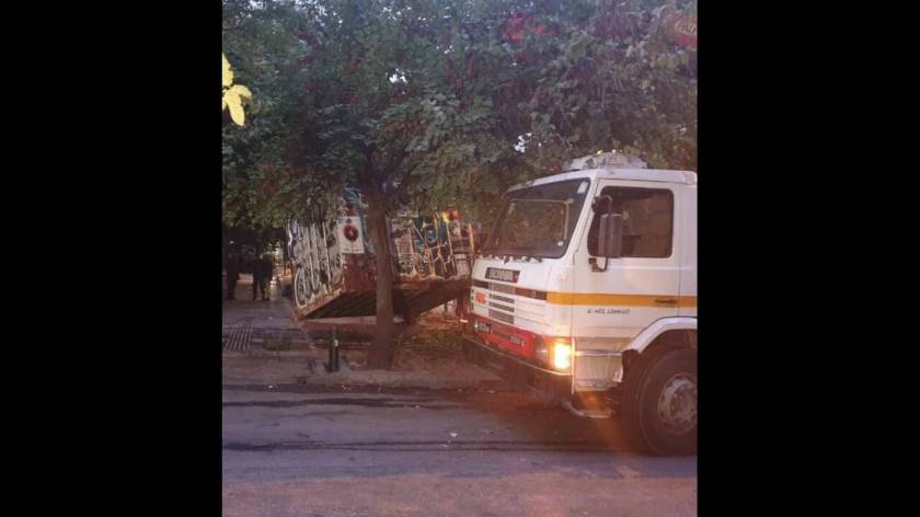 Με γερανό απομακρύνεται το κοντέινερ που είχε εγκατασταθεί παράνομα στην πλατεία Εξαρχείων από αντιεξουσιαστές.