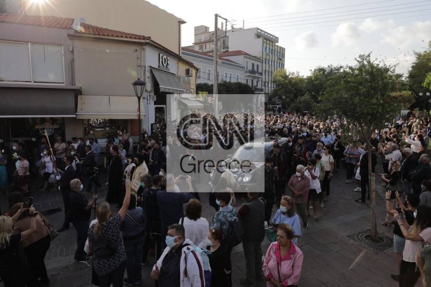 Κατά τη σύντομη στάση στη δημοτική αγορά, συγκεντρωμένοι με δάκρυα στα μάτια αποχαιρέτησαν με ένα παρατεταμένο χειροκρότημα τον Μίκη Θεοδωράκη, φωνάζοντας «αθάνατος».