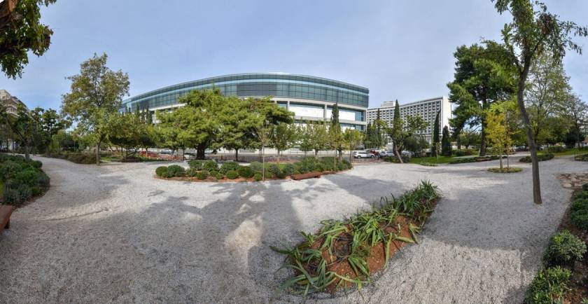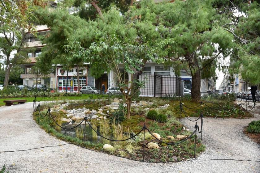 Ο συνδυασμός των κλαδεμένων θάμνων με τους βράχους και τα βότσαλα διαμόρφωσαν «ήρεμα» μονοπάτια μέσα στον κήπο, ενώ τα κατασκευασμένα από γρανίτη καθιστικά, δημιούργησαν έναν όμορφο χώρο συνάντησης, προσφέροντας στους επισκέπτες του πάρκου τη δυνατότητα της απομόνωσης και της γαλήνης, στην «καρδιά» της πόλης.