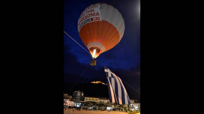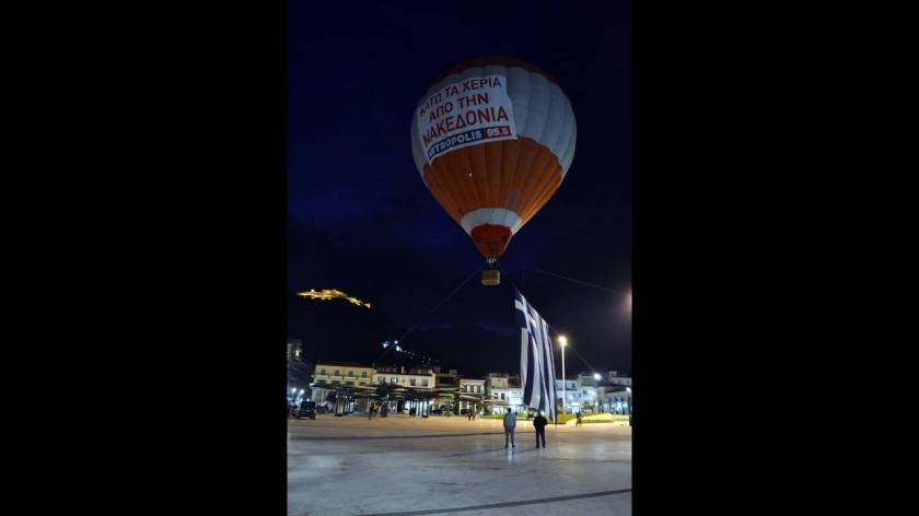 Ένα αερόστατο με σύνθημα «Κάτω τα χέρια από τη Μακεδονία», από το οποίο κυματίζει η ελληνική σημαία υψώθηκε στο Άργος.