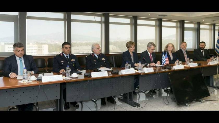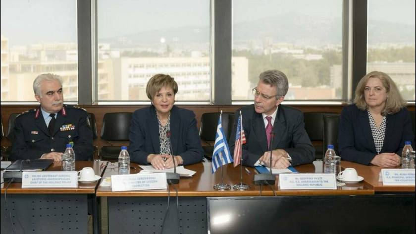 Στο περιθώριο της σημερινής συνάντησης της υπουργού Προστασίας του Πολίτη Όλγας Γεροβασίλη με την αρμόδια για θέματα καταπολέμησης τρομοκρατίας και βίαιου εξτρεμισμού αξιωματούχο του αμερικανικού υπουργείου Εξωτερικών Αλίνα Ρομανόφκσι, ο Προϊστάμενος Επιτελείου της ΕΛ.ΑΣ. Αντιστράτηγος Ανδρέας Δασκαλάκης και ο Αμερικανός πρέσβης στην Αθήνα Τζέφρυ Πάιατ, παρουσία και του Αρχηγού της ΕΛ.ΑΣ Αντιστρατήγου Αριστείδη Ανδρικόπουλου, υπέγραψαν Μνημόνιο Συνεργασίας μεταξύ της Ελληνικής Αστυνομίας και της Υπηρεσίας Τελωνείων και Προστασίας Συνόρων του υπουργείου Εσωτερικής Ασφάλειας των Η.Π.Α.