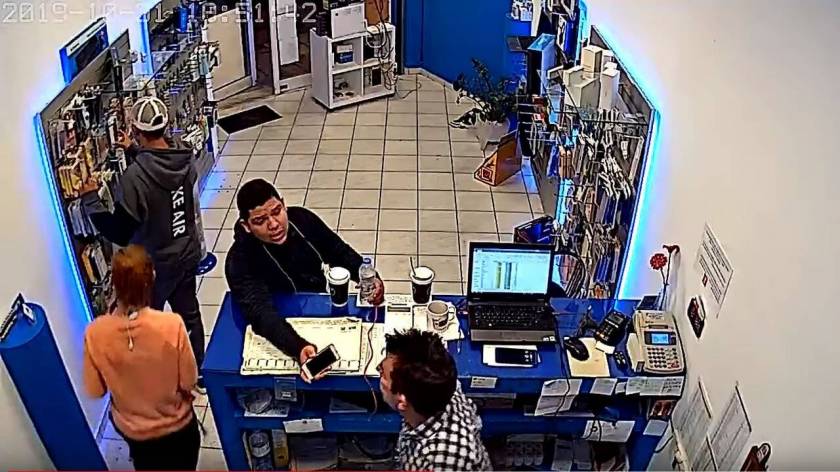 Στη συνέχεια, στο κατάστημα μπαίνει και μια κοπέλα κι ενώ οι άλλοι δύο «βομβαρδίζουν» με ερωτήσεις τον ιδιοκτήτη, εκείνη ανενόχλητη αρπάζει μια θήκη και την κρύβει κάτω από την μπλούζα της, ενώ στη συνέχεια φαίνεται να τη δίνει στον έναν από τους δύο συνεργούς.