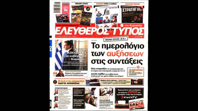 Η πανδημία του νέου κορωνοϊού δεσπόζει για ακόμη μία φορά, όπως είναι αναμενόμενο, στα πρωτοσέλιδα των κυριακάτικων εφημερίδων της Κυριακής 05 Απριλίου 2020. Μεταξύ των θεμάτων που παρουσιάζονται, πρωτοστατεί η διάρκεια της καραντίνας, αλλά και το θέμα των συντάξεων.