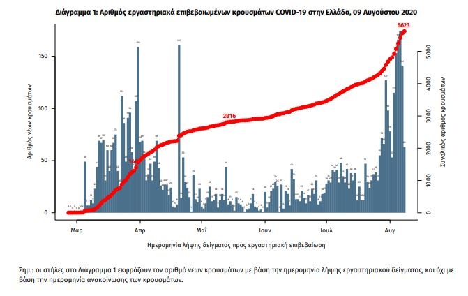 Ο ΕΟΔΥ ανακοίνωσε σήμερα, Κυριακή, 203 νέα κρούσματα του νέου κορωνοϊού στη χώρα, εκ των οποίων τα 29 εντοπίστηκαν κατόπιν ελέγχων στις πύλες εισόδου της χώρας. Ο συνολικός αριθμός των κρουσμάτων είναι 5.623, εκ των οποίων το 54.8% αφορά άνδρες.