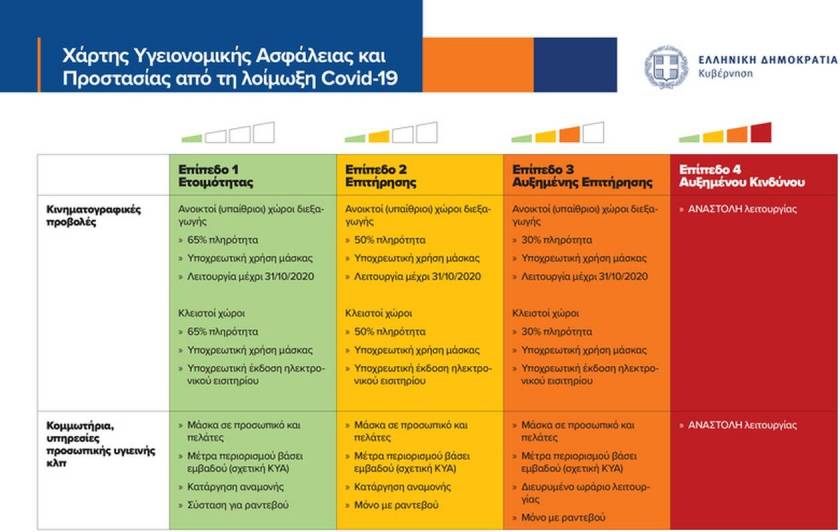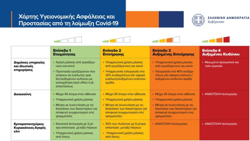 Εντάσσει τις 74 περιφερειακές ενότητες της Ελλάδας σε επίπεδα υγειονομικής ασφάλειας και προστασίας με αντίστοιχες δέσμες μέτρων που ισχύουν για όλους. Πιο συγκεκριμένα εντάσσονται στα εξής επίπεδα: