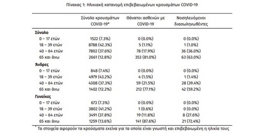 Τέλος, έχουμε 5 ακόμα καταγεγραμμένους θανάτους και 436 θανάτους συνολικά στη χώρα. 161 (36.9%) γυναίκες και οι υπόλοιποι άνδρες. Η διάμεση ηλικία των θανόντων συμπολιτών μας ήταν τα 79 έτη και το 96.6% είχε κάποιο υποκείμενο νόσημα ή/και ηλικία 70 ετών και άνω.