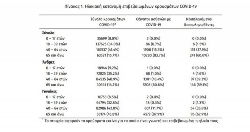 ασθενείς.Η διάμεση ηλικία των κρουσμάτων είναι 43 έτη (εύρος 0.2 έως 106 έτη), ενώ η διάμεση ηλικία των θανόντων είναι 78 έτη (εύρος 0.2 έως 106 έτη)».