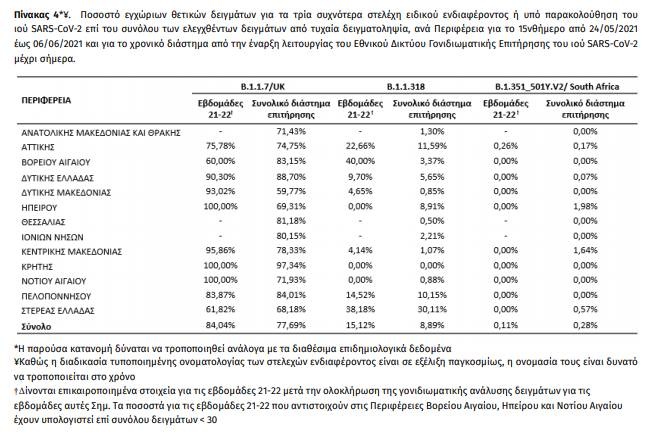 Επιπλέον, έχουν απομονωθεί συνολικά 117 στελέχη ειδικού ενδιαφέροντος ή υπό παρακολούθηση ή ενδιαφέροντος από δείγματα εισαγόμενων κρουσμάτων, εκ των οποίων 104 αφορούν στο B.1.1.7 (Variant VOC 202012/01), 4 στο B.1.351/501Y.V2/South Africa (Variant VOC 202012/02), 3 στο B.1.617.2 (VOC-21APR-02), 4 στο Β.1.1.318 (Variant E484K), 1 στο B.1.617.1 (VUI-21APR-01) και 1 στο B.1.525 (Variant VUI-202102/03)».