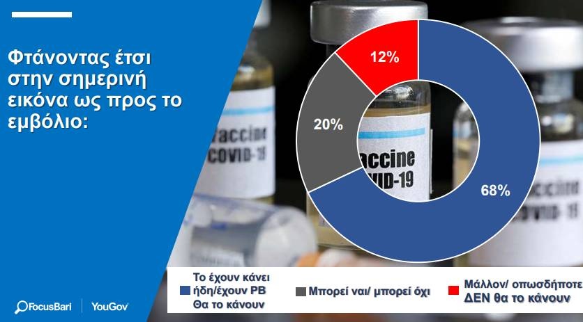 Τέλος, στη σημερινή εικόνα, σε ποσοστό 68% οι ερωτηθέντες δηλώνουν πως έχουν ήδη κάνει το εμβόλιο ή προτίθενται να το κάνουν, σε ποσοστό 12% δηλώνουν ότι δεν θα το κάνουν και ένα ακόμα ποσοστό 20% δηλώνουν ότι δεν έχουν ακόμα αποφασίσει αν θα το κάνουν ή όχι.