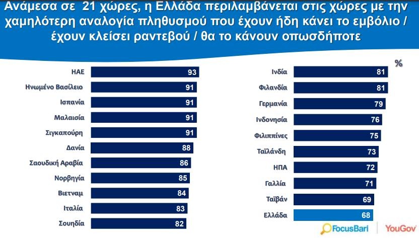 Το 68% των Ελλήνων, δηλώνει είτε πως έχει κάνει ήδη το εμβόλιο, είτε πως έχει κλείσει ραντεβού, είτε ότι θα το κάνει οπωσδήποτε καταλαμβάνοντας την 21η θέση.