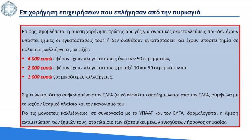 Τέλος, προβλέπεται η επιχορήγηση μέρους της συνολικής εκτιμηθείσας ζημίας σε πληττόμενες επιχειρήσεις, συμπεριλαμβανομένων και αγροτικών εκμεταλλεύσεων.