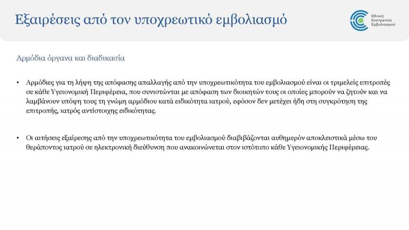 Αρµόδιες για τη λήψη της απόφασης απαλλαγής από την υποχρεωτικότητα του εµβολιασµού είναι οι τριµελείς επιτροπές σε κάθε Υγειονοµική Περιφέρεια, που συνιστώνται µε απόφαση των διοικητών τους οι οποίες µπορούν να ζητούν και να