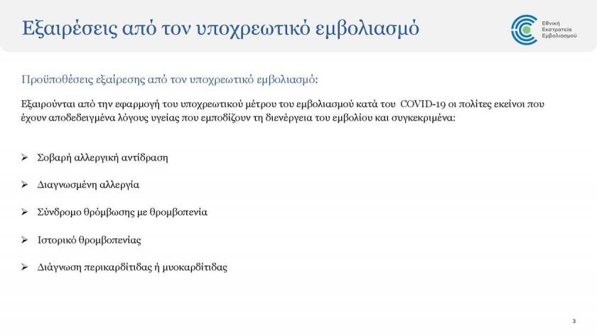 Συγκεκριμένα, υπογραμμίζεται ότι οι όποιες εξαιρέσεις αφορούν κατοίκους εξωτερικού, αυτούς που έχουν απόφαση απαλλαγής από την υποχρεωτικότητα του εµβολιασµού από τις τριµελείς Υγειονομικές Επιτροπές κάθε Περιφέρειας για λόγους υγείας (πχ σοβαρή αλλεργική αντίδραση, διαγνωσµένη αλλεργία, ιστορικό θροµβοπενίας κλπ), όσους έχουν εμβολιαστεί στο εξωτερικό, όσους έχουν κάνει αίτηση εμβολιασμού κατ' οίκον και δεν έχει γίνει ακόμη εμβολιασμός.