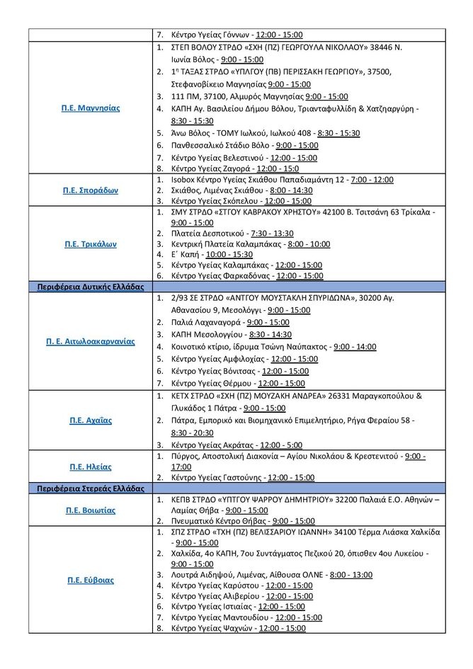 - Πιερία, Κέντρο Υγείας Αιγινίου, 09:00-15:00
