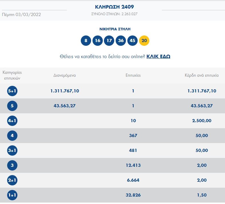 Οι τυχεροί αριθμοί που έβγαλε η κληρωτίδα είναι οι: 8, 16, 17, 36, 45