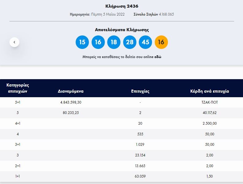 Οι τυχεροί αριθμοί που έβγαλε η κληρωτίδα είναι οι: 15, 16, 18, 28, 45