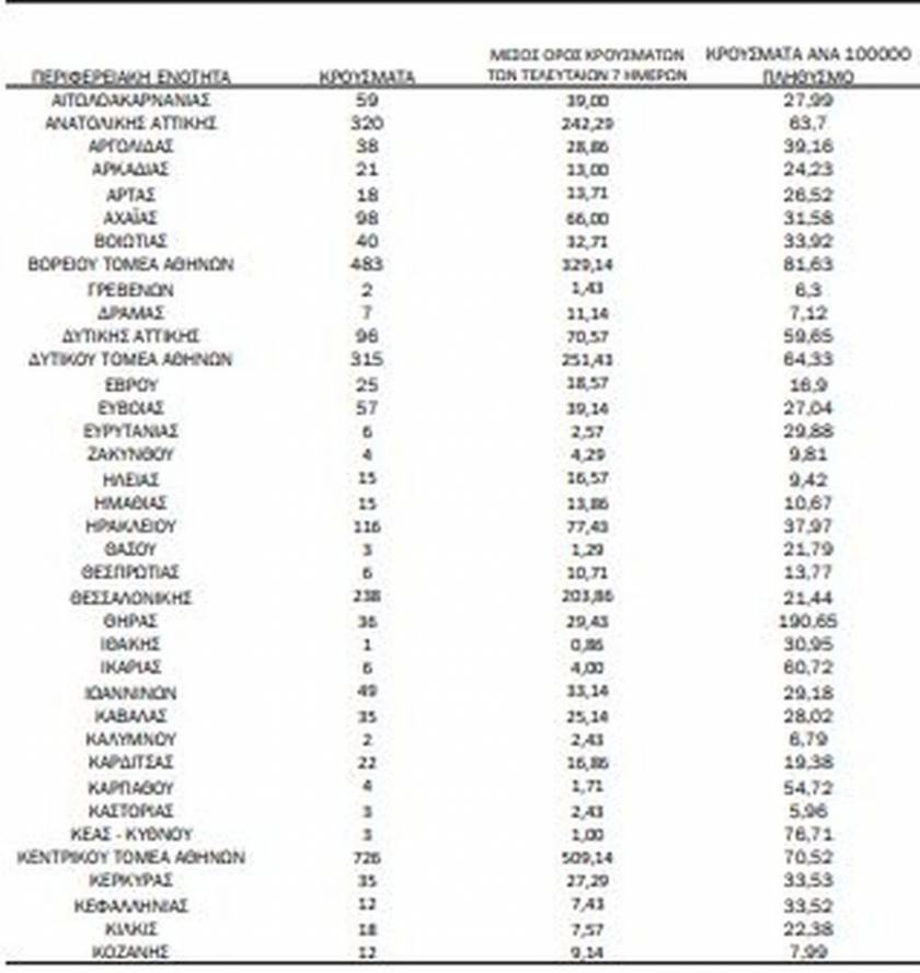Η κατανομή των 4.510 νέων εγχώριων κρουσμάτων ανά Περιφερειακή Ενότητα παρουσιάζεται στον κατωτέρω πίνακα.