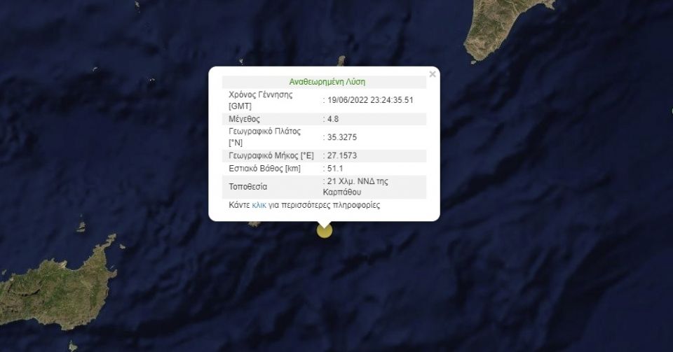 Σύμφωνα με το Γεωδυναμικό Ινστιτούτο, το επίκεντρο του σεισμού ήταν θαλάσσια περιοχή 21 χιλιόμετρα από το νησί της Καρπάθου.