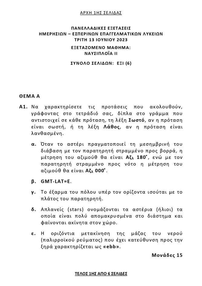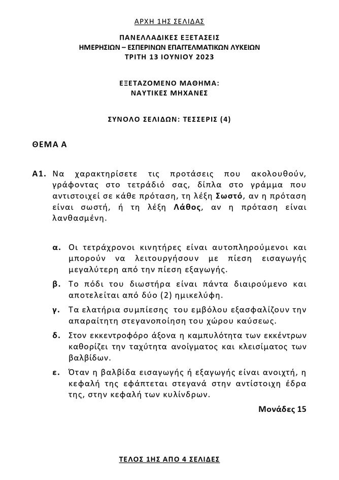 Τα θέματα στα οποία διαγωνίστηκαν σήμερα, Τρίτη 13 Ιουνίου οι υποψήφιοι και οι υποψήφιες των Πανελληνίων Εξετάσεων του 2023 των ΕΠΑΛ στα μαθήματα Ηλεκτρικές Μηχανές, Σύγχρονες Γεωργικές Επιχειρήσεις, Ναυσιπλοία ΙΙ, Ναυτικές Μηχανές , ανακοίνωσε το υπουργείο Παιδείας.