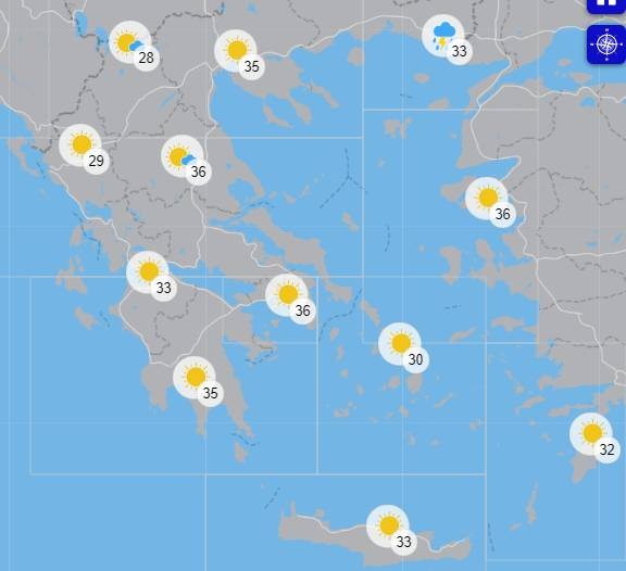 Η θερμοκρασία θα σημειώσει μικρή περαιτέρω άνοδο και θα φθάσει στην ηπειρωτική χώρα τους 34 με 37 και κατά τόπους στα ανατολικά ηπειρωτικά τους 38 βαθμούς Κελσίου. Στα νησιά θα φτάσει τους 30 με 33 βαθμούς και στη νότια Κρήτη τους 35 βαθμούς Κελσίου.