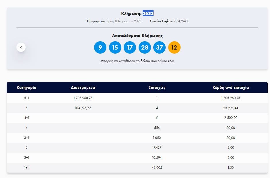 Πραγματοποιήθηκε το βράδυ της Τρίτης (08/08) η κλήρωση 2633 του Τζόκερ που μοίραζε 1.705.960,75 ευρώ.