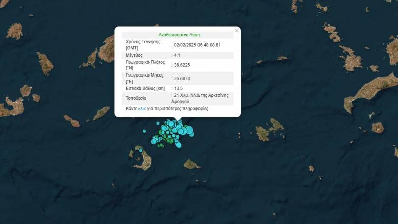 Ο σεισμός σημειώθηκε στις 08:48 σήμερα το πρωί, είχε εστιακό βάθος 13.5 χιλιόμετρα και σημειώθηκε 21 Χλμ. ΝΝΔ της Αρκεσίνης Αμοργού.
