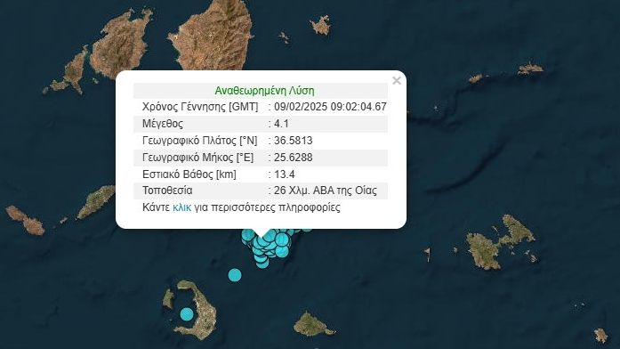 Ένας ακόμη σεισμός μεγέθους 4,1 βαθμών της κλίμακας Ρίχτερ σημειώθηκε λίγο μετά τις 11:00 την Κυριακή (9/2) στην Σαντορίνη.