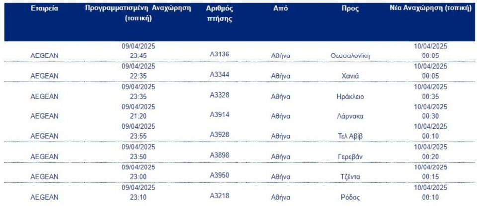 Συγκεκριμένα, την Τετάρτη 9 Απριλίου 2025 ακυρώνονται όλες οι προγραμματισμένες πτήσεις του δικτύου εσωτερικού και εξωτερικού, εκτός από τις παρακάτω, οι οποίες θα πραγματοποιηθούν με τις κάτωθι τροποποιήσεις: