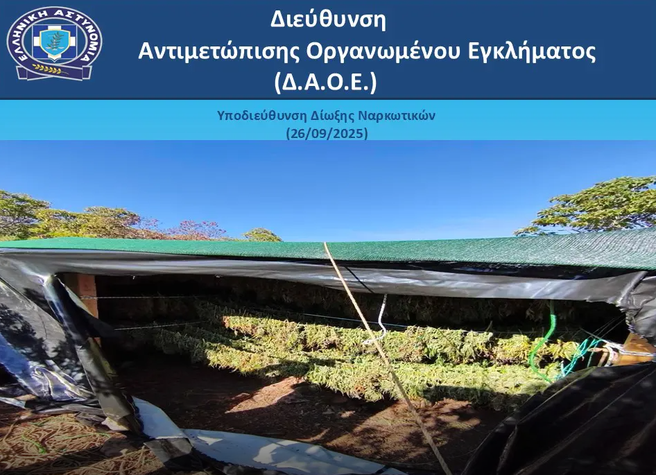 Από τη Διεύθυνση Αντιμετώπισης Οργανωμένου Εγκλήματος εξαρθρώθηκε εγκληματική οργάνωση, τα μέλη της οποίας δραστηριοποιούνταν στην καλλιέργεια δενδρυλλίων κάνναβης με την εγκατάσταση πλήρως εξοπλισμένης φυτείας, καθώς και στη διακίνηση σημαντικών ποσοτήτων ακατέργαστης κάνναβης, σε διάφορες περιοχές της Αττικής και της Αρκαδίας.