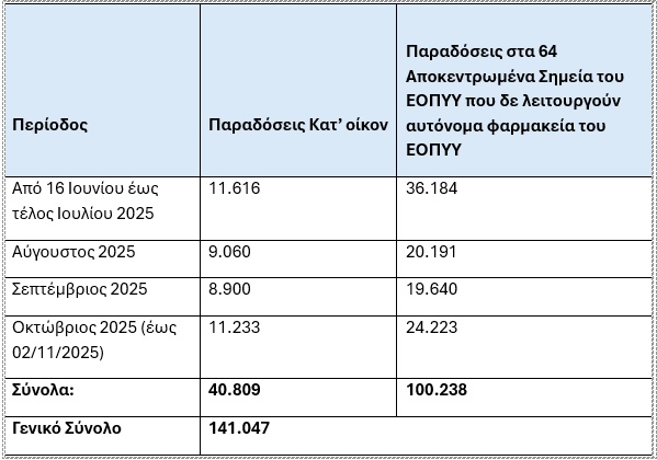 Η νέα δωρεάν υπηρεσία «Κατ’ Οίκον» αποστολής Φαρμάκων Υψηλού Κόστους (ΦΥΚ) από τον ΕΟΠΥΥ έχει εξυπηρετήσει κατά το πρώτο τετράμηνο εφαρμογής της (από 16/6/2025 έως 02/11/2025) συνολικά 141.047 ασθενείς οι οποίοι παρέλαβαν τη φαρμακευτική τους αγωγή είτε κατοίκον (40.809 ασθενείς) είτε στα 64 αποκεντρωμένα σημεία του ΕΟΠΥΥ που δεν λειτουργούν αυτόνομα φαρμακεία του ΕΟΠΥΥ (100.238 ασθενείς).