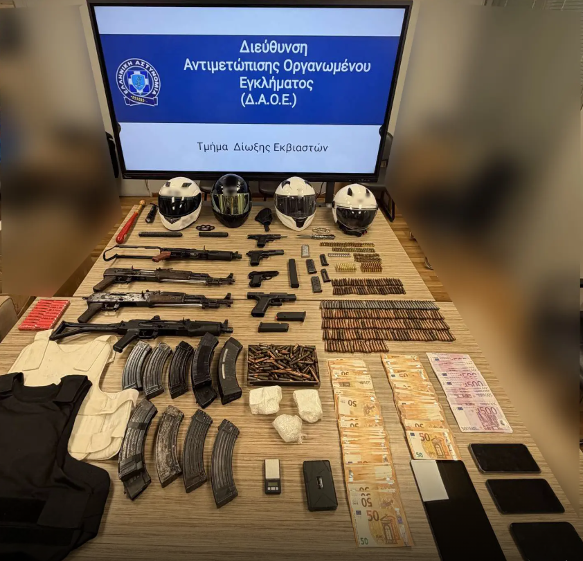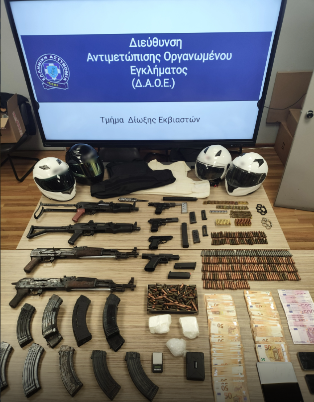 Οπλα, σφαίρες, κοκαϊνη και χρήματα που βρέθηκαν στην κατοχή των συλληφθέντων