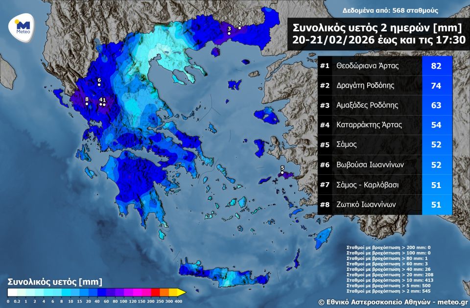 Μεγάλα ύψη βροχής καταγράφηκαν σε Ήπειρο και Θράκη, την Παρασκευή 20 και το Σάββατο 21 Φεβρουαρίου.