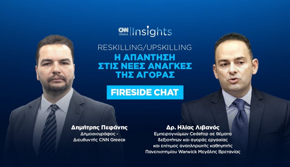 Ο Δρ. Ηλίας Λιβανός – Εμπειρογνώμων Cedefop σε θέματα δεξιοτήτων και αγοράς εργασίας και επίτιμος αναπληρωτής καθηγητής Πανεπιστημίου Warwick Μεγάλης Βρετανίας, σε Fireside Chat με τον Δημήτρη Πεφάνη, Διευθυντή CNN Greece