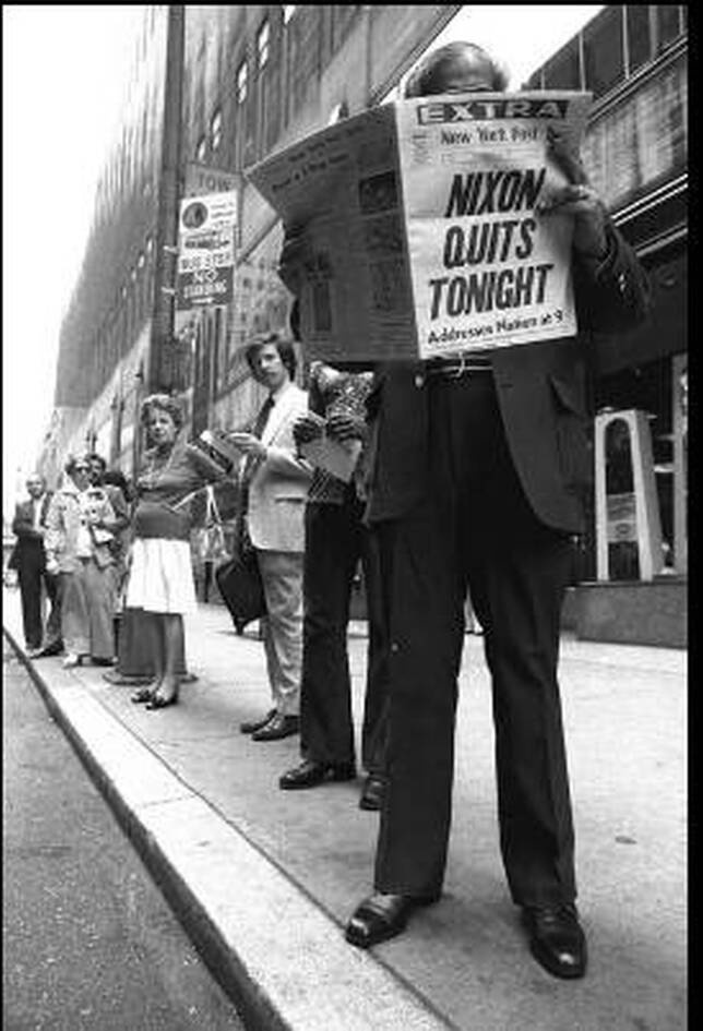 1974, Νέα Υόρκη. Άνθρωποι περιμένουν για το λεωφορείο και διαβάζουν στην εφημερίδα τα νέα για την απόφαση του Προέδρου Νίξον να παραιτηθεί.