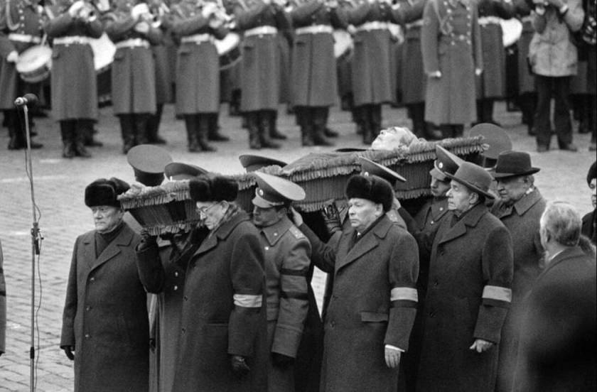 1982, Μόσχα. Η κηδεία του Λεονίντ Μπρέζνιεφ στη Μόσχα. Τα μέλη του Σοβιετικού Κομμουνιστικού Κόμματος αποτίουν φόρο τιμής στον πρώην γραμματέα του.