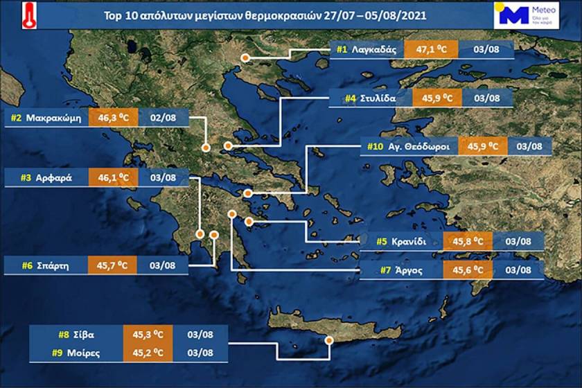 - 3/8 Λαγκαδάς Θεσσαλονίκης 47,1 (η υψηλότερη μέγιστη θερμοκρασία όλου του καύσωνα),