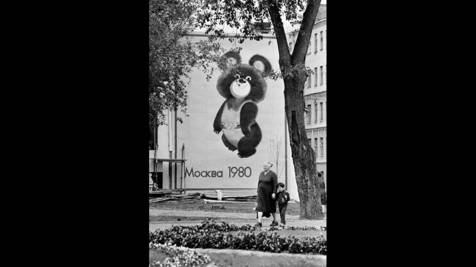 1979, Μόσχα. Μια γυναίκα και ο εγγονός της περπατούν μπροστά από μια αφίσα με το Μίσα, τη μασκότ των Ολυμπιακών Αγώνων της Μόσχας, που θα γίνουν το 1980.