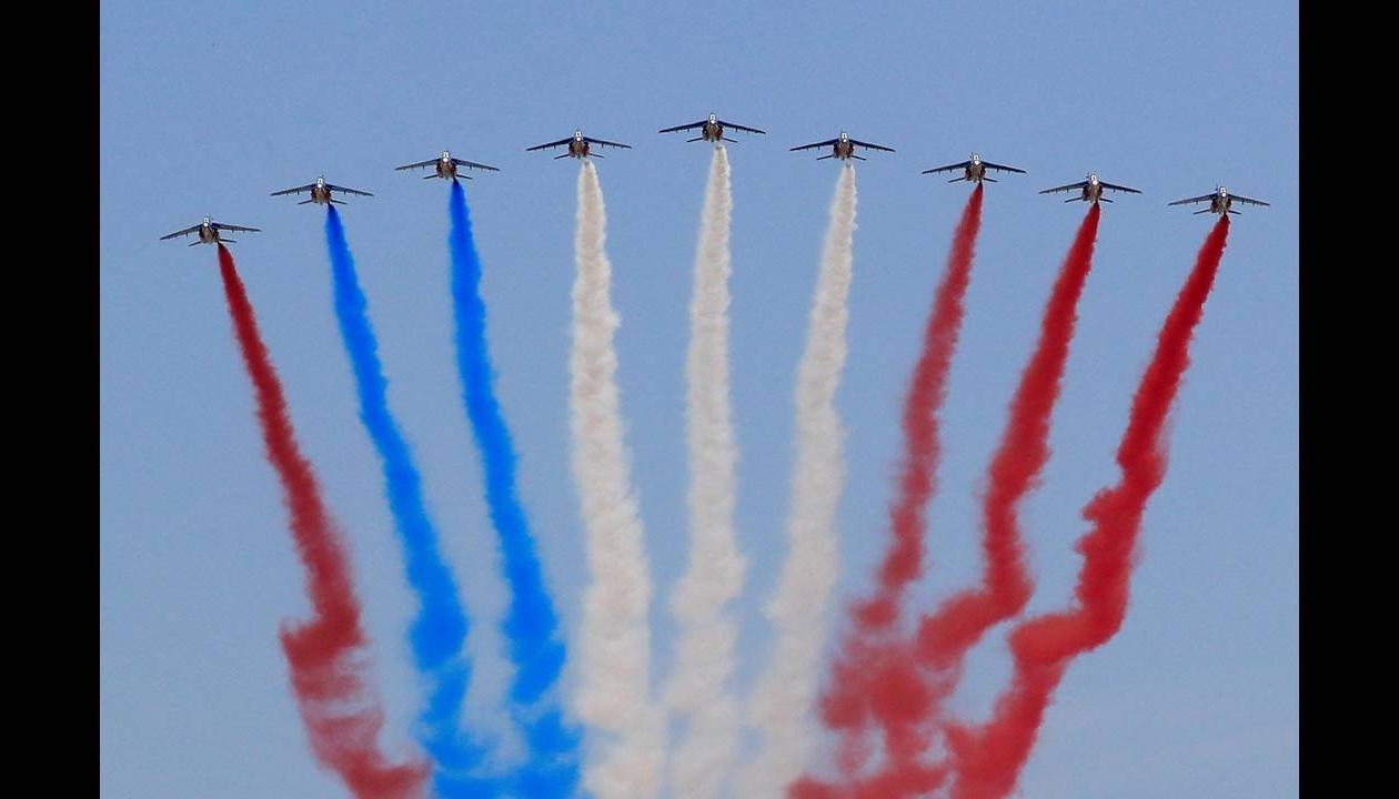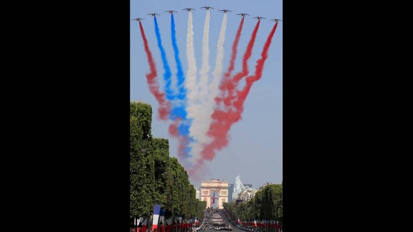 Τα απρόοπτα δεν έλειψαν από τη στρατιωτική παρέλαση: το ένα από τα εννέα Alphajet που θα σχημάτιζαν στον ουρανό τη γαλλική σημαία, έβγαλε κόκκινο και όχι μπλε καπνό.