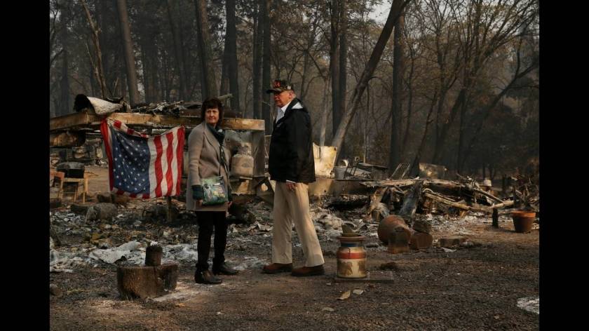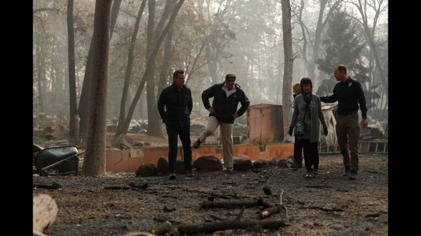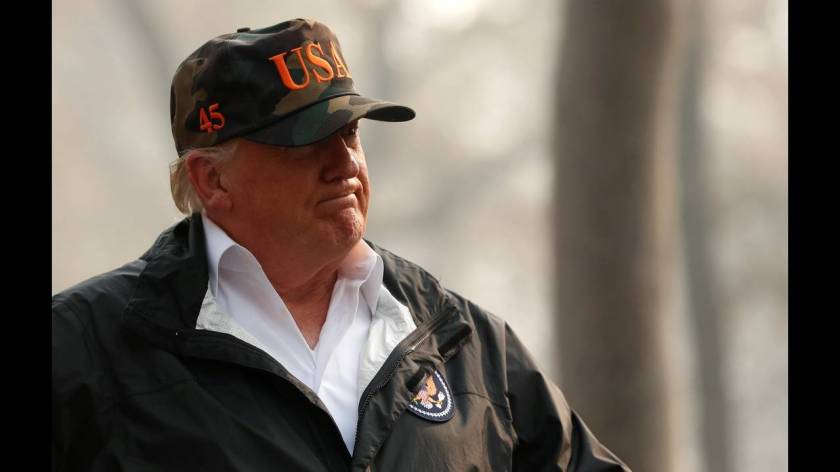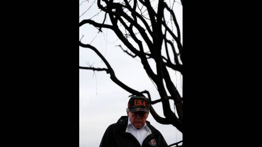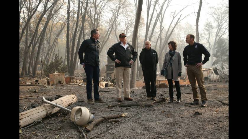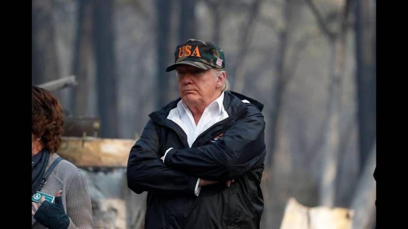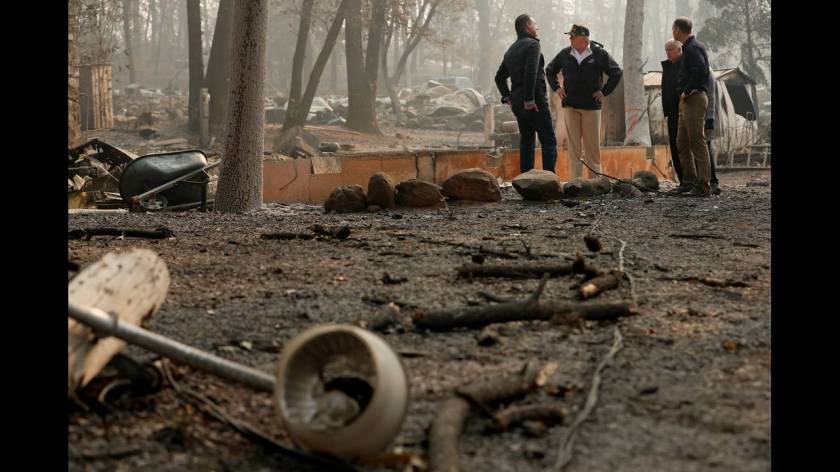 Με πρόσωπο σοβαρό και φορώντας καπέλο παραλλαγής που έγραφε «USA», ο Ντόναλντ Τραμπ επισκέφθηκε την μικρή κοινότητα του Παραντάιζ που καταστράφηκε ολοσχερώς από την πυρκαγιά στην Καλιφόρνια. «Είναι πολύ θλιβερό να το βλέπεις», δήλωσε.