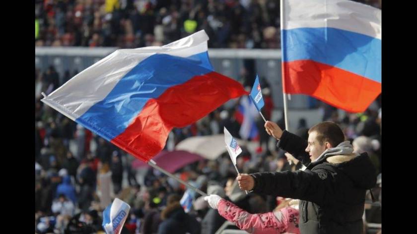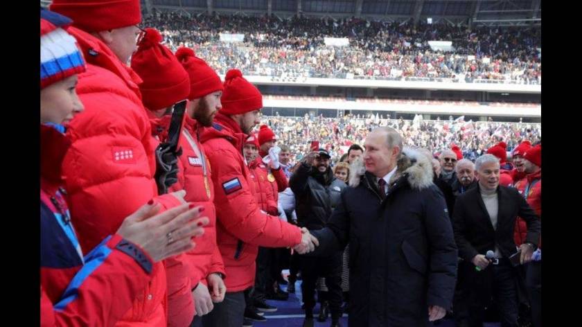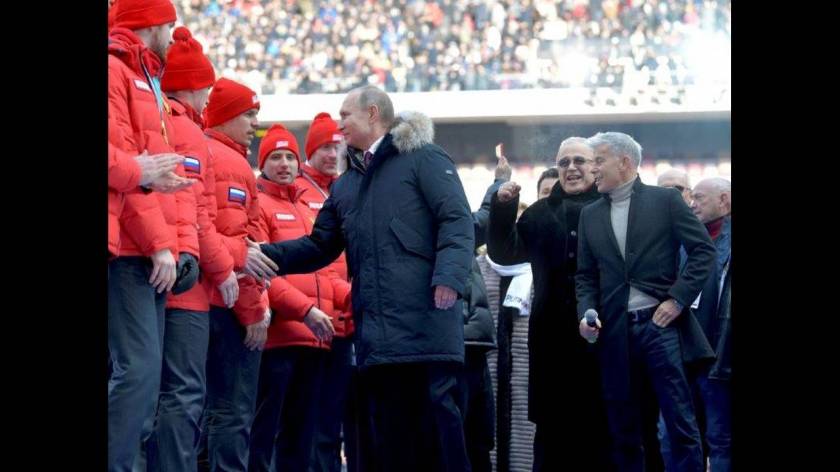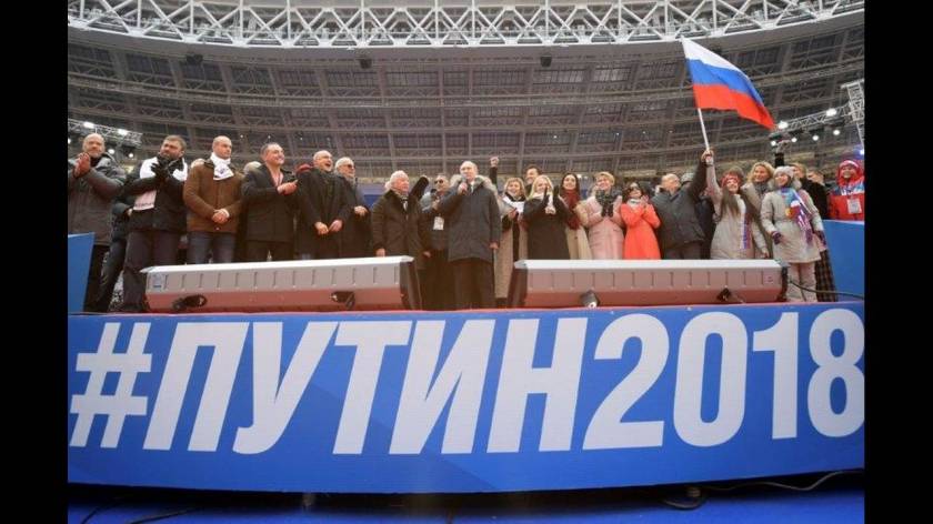 Πολλοί Ρώσοι αθλητές, τραγουδιστές και κοσμοναύτες ανέβηκαν στη σκηνή για να εκφράσουν την υποστήριξή τους στον Πούτιν ο οποίος κυβερνά τη Ρωσία εδώ και περίπου δύο δεκαετίες και θέλει να παραμείνει στο Κρεμλίνο μέχρι το 2024.